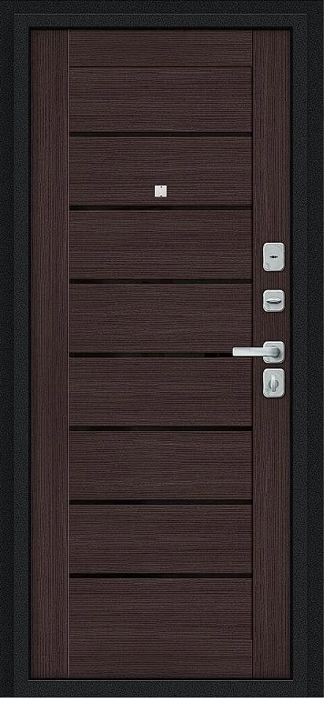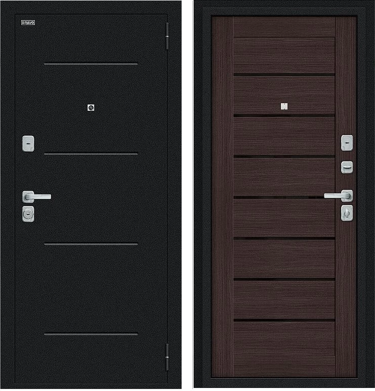 Надежная входная Дверь Браво Техно/BChrome Букле черное/Wenge Melinga премиум класса по цене 34 687 руб. Большая толщина стали защитит от проникновения в ваш дом, квартиру или коттедж. Используется очень качественная фурнитура: замки, цилиндры, ручки, защелки. Покрытие и отделка двери изготовлено под внимательным контролем производителя. Дверь имеет долгий срок службы и гарантию.