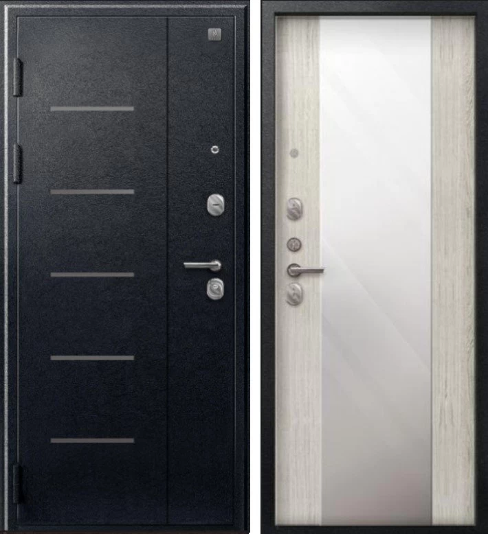 Надежная входная Дверь V-04 Черный муар - Полярный дуб Зеркало премиум класса по цене 42 287 руб. Большая толщина стали защитит от проникновения в ваш дом, квартиру или коттедж. Используется очень качественная фурнитура: замки, цилиндры, ручки, защелки. Покрытие и отделка двери изготовлено под внимательным контролем производителя. Дверь имеет долгий срок службы и гарантию.